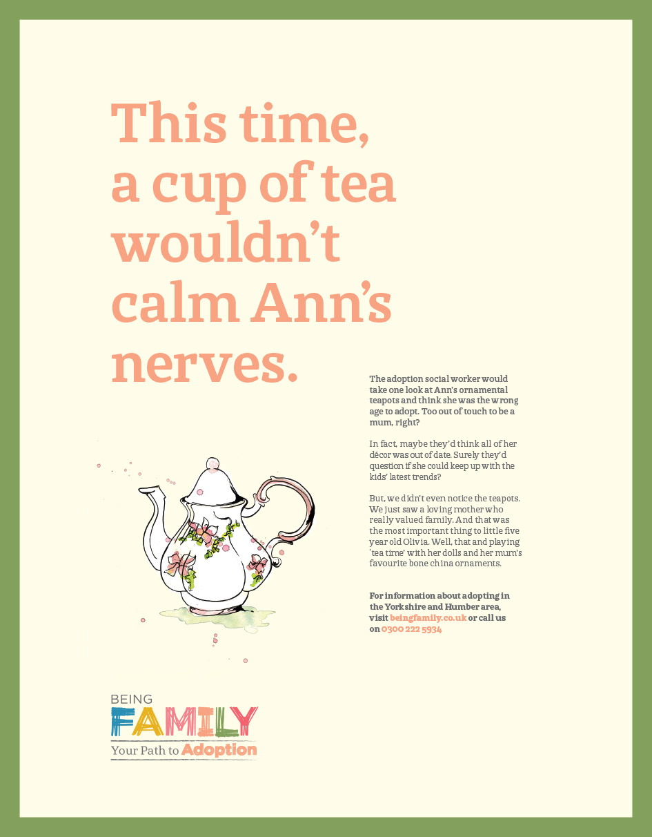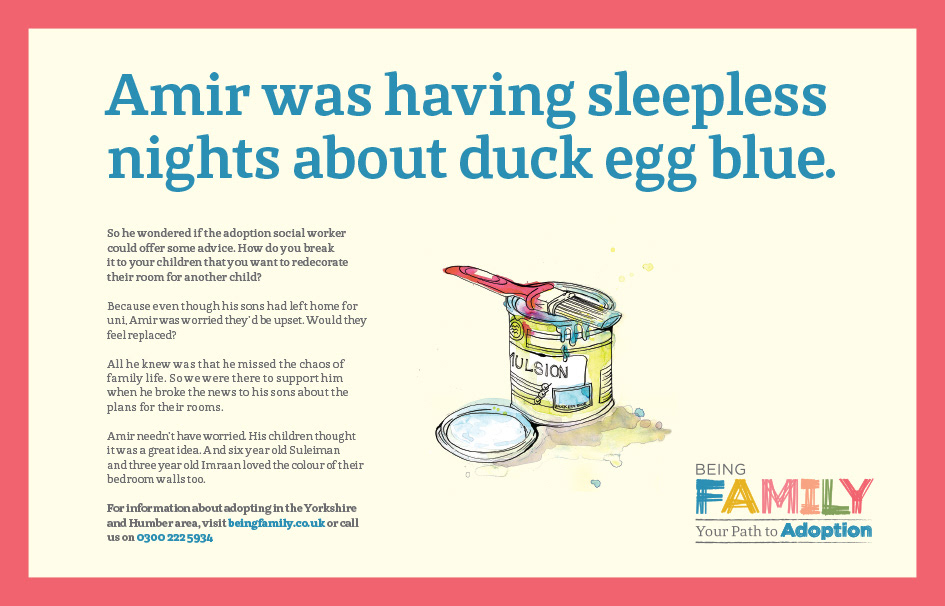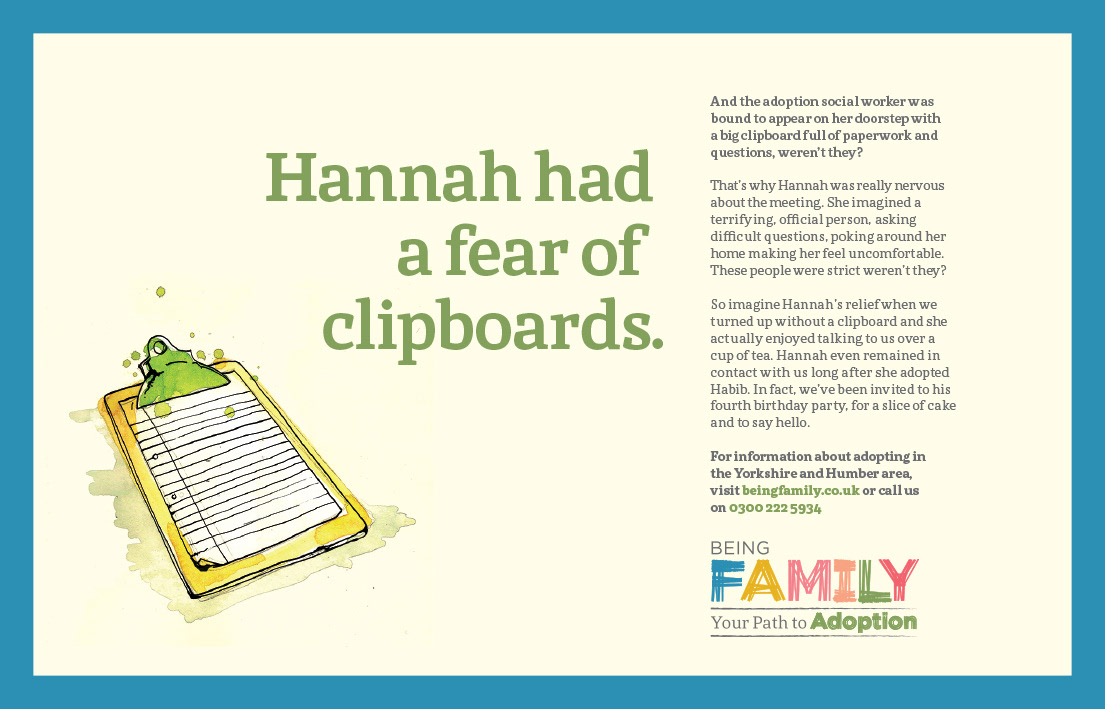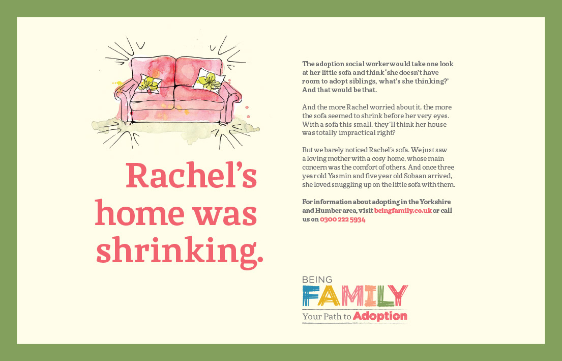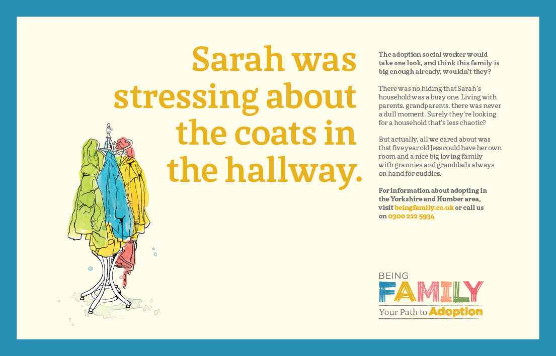 Lovely illustration campaign to work on for adoption. Media covered leaflets, small format posters, out of home, press & web.
